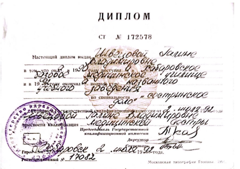 - 1992 - Хабаровское базовое медицинское училище, специальность «Сестринское дело».