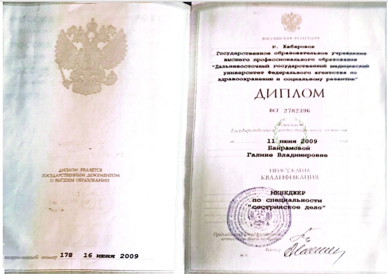 - 2009 - Дальневосточный государственный медицинский университет, менеджер по специальности «Сестринское дело».