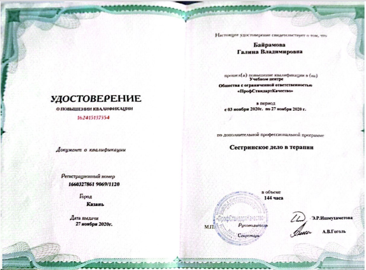 - 2020 - Повышение квалификации «Сестринское дело в терапии», ООО «ПрофСтандартКачество».