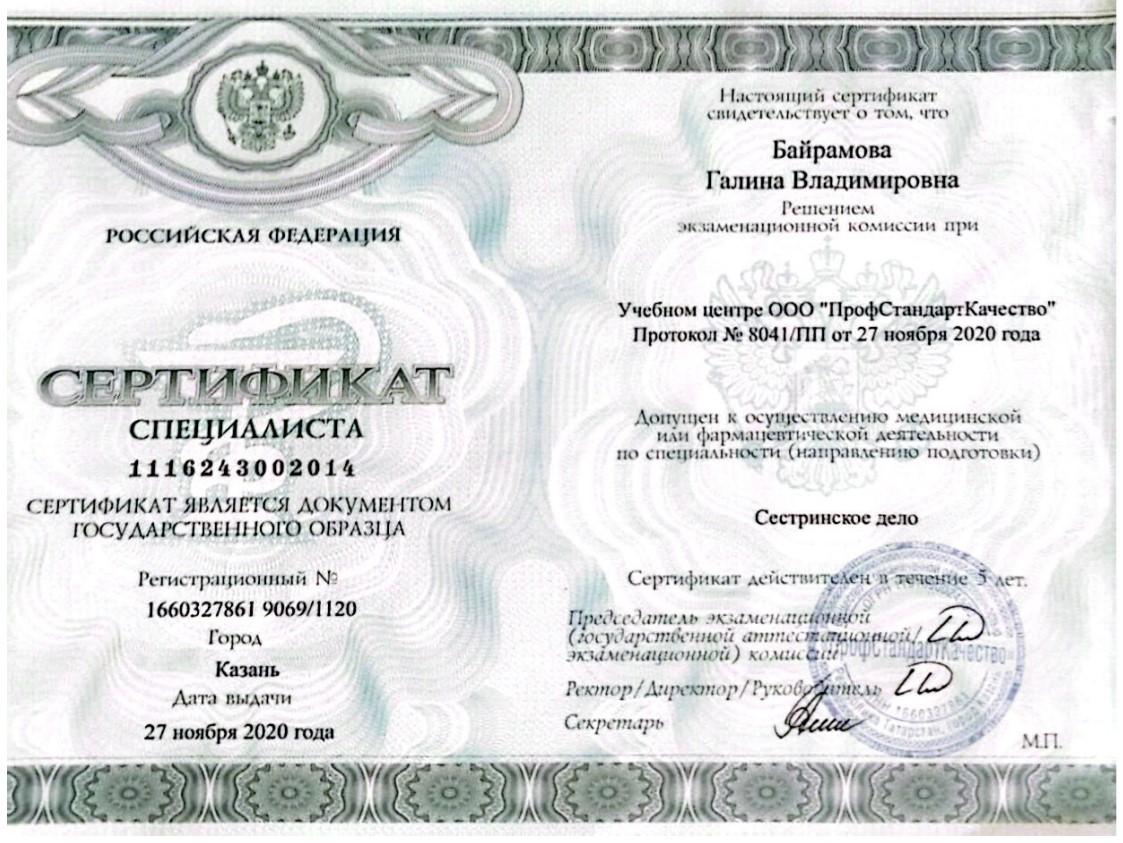 - 2020 - Сертификат специалиста по специальности «Сестринское дело», ООО «ПрофСтандартКачество».