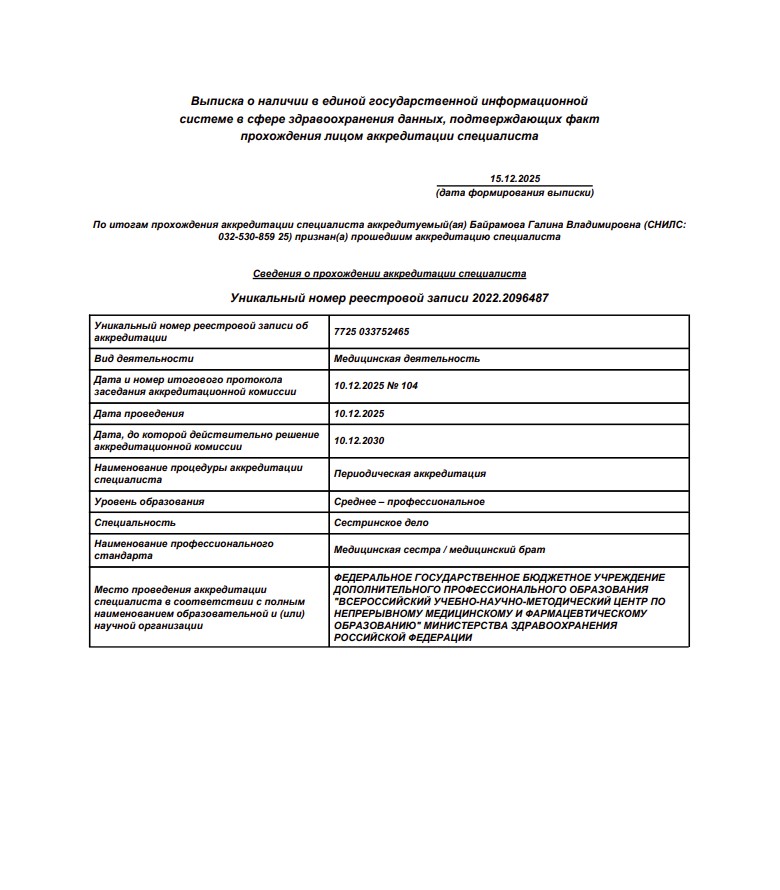 - Аккредитация по специальности «Сестринское дело» действует до 10.12.2030, ФГБУ ДПО НМФО Минздрава РФ.